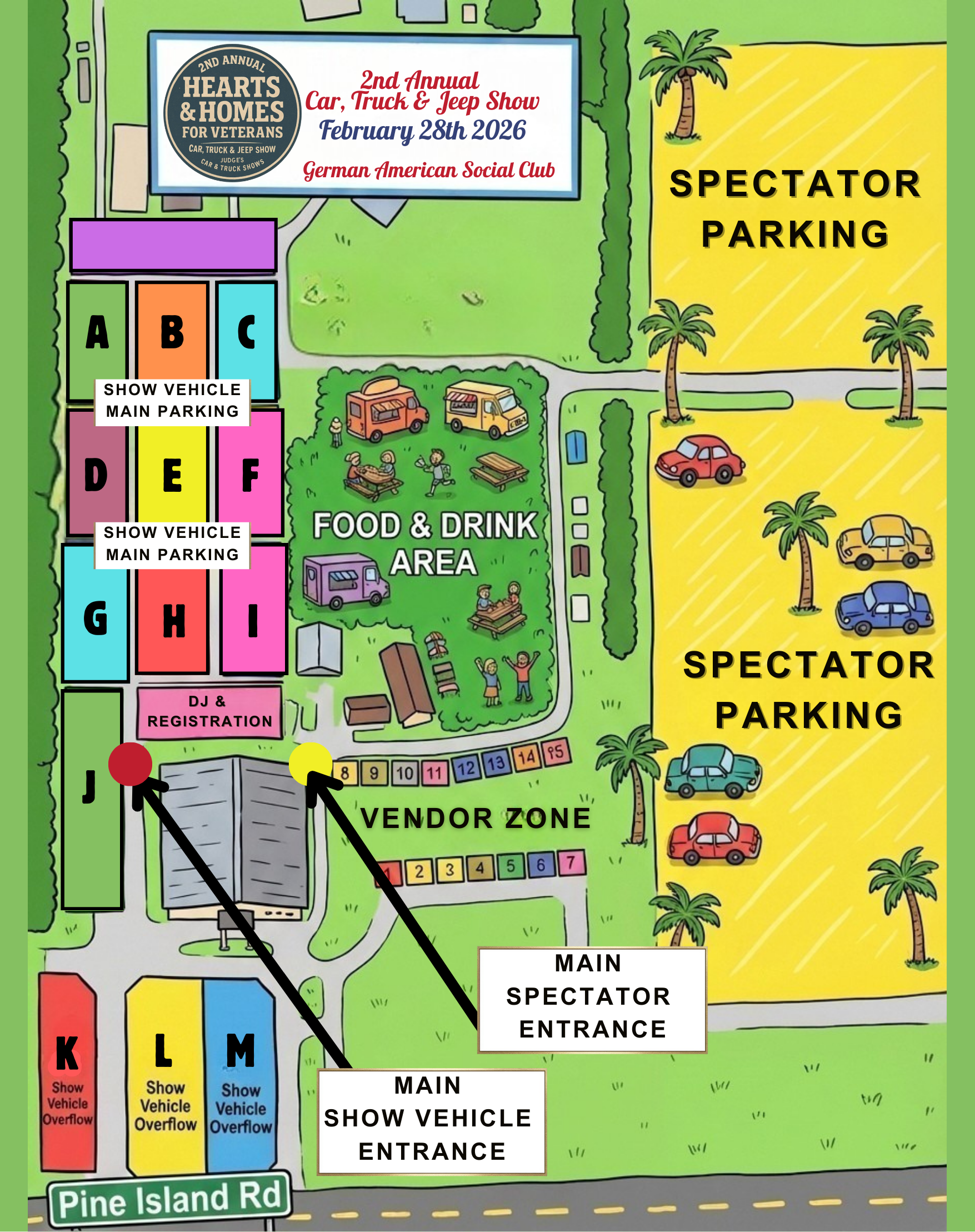 - If you are part of a club or have a group that would like to park together please arrive together. We are not able to reserve spaces within the show area.